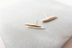 Matte white porcelain with shiny 22k gold luster on one of the elongated bead. Gold luster is applied and fired in the kiln to be fused to the surface permanently.